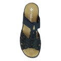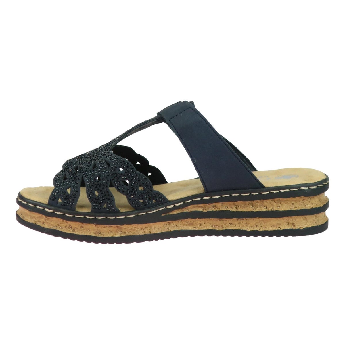 Kaunis Rieker sandaali säädettävällä remmillä. "Korkkipohja" on rennon, mutta samalla tyylikkään näköinen ja yksinkertainen sininen päällinen timanteilla viimeistelee ulkonäön. Sisäpohja on miellyttävän pehmeää mikrofibertekstiiliä. Helppo pukea jalkaan. Sopii niin arkeen kuin rennompiin juhliin. Lesti normaali.